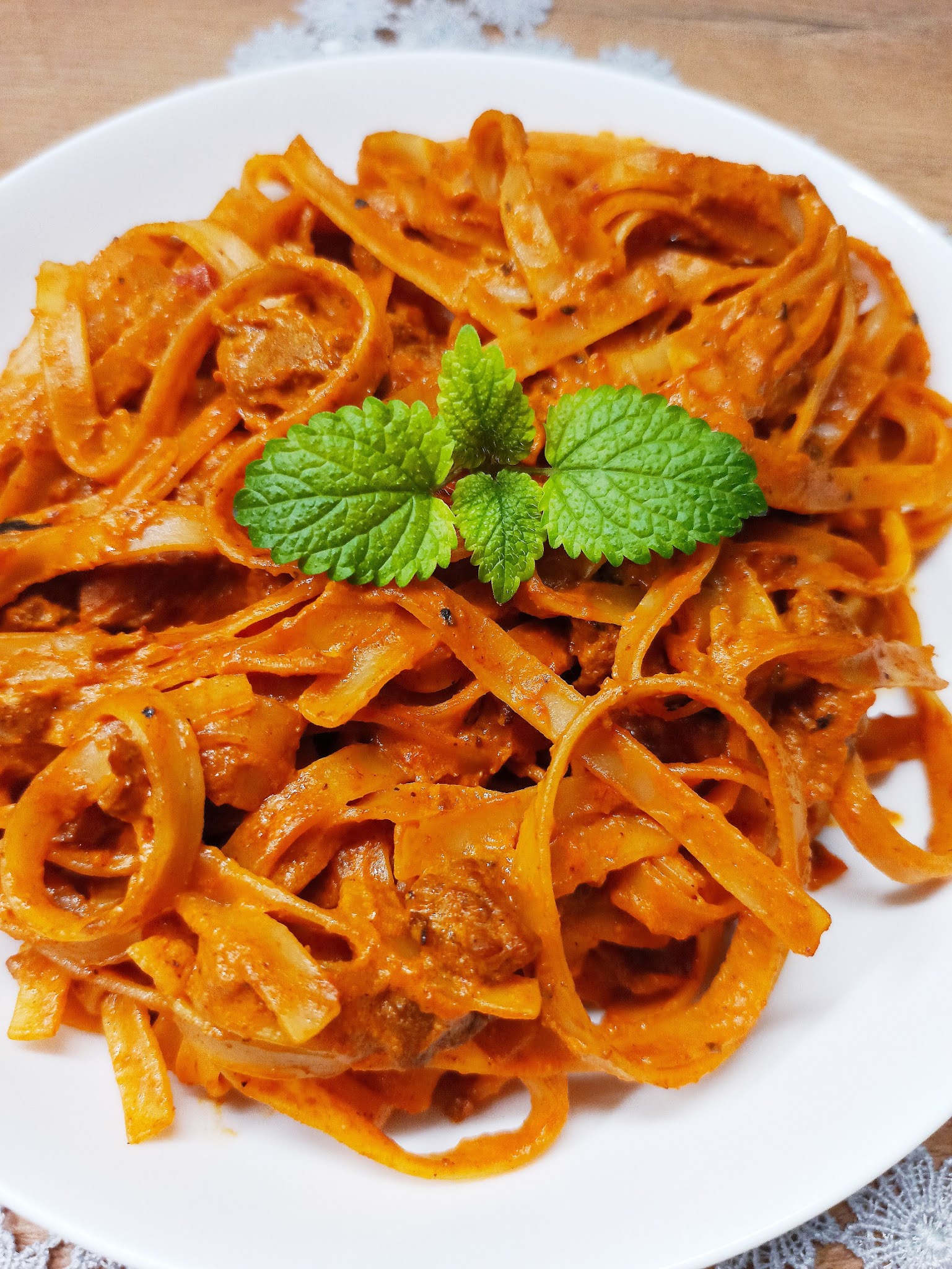 Makaron ryżowy z kurczakiem w sosie pomidorowym – przygotowanie: