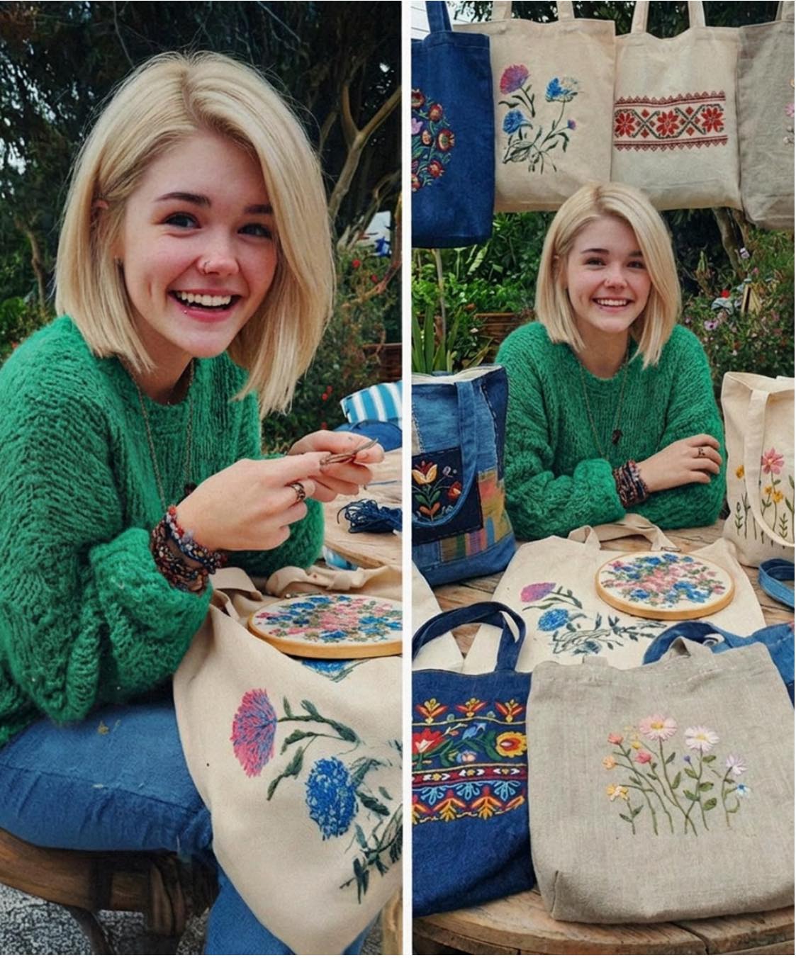 Stolik Avy stał przy wejściu. Ułożyła 21 toreb w dwóch równych rzędach, z małym, ręcznie napisanym napisem: „Wykonane z darowanego materiału. Cały dochód przeznaczony na zbiórkę odzieży zimowej! :)”