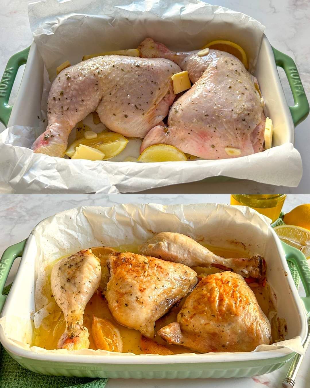 Przygotowanie jest bardzo proste. Wystarczy natrzeć kurczaka sokiem z cytryny i skropić emulsją z oliwy z oliwek extra vergine, soli, pieprzu, posiekanego suszonego mięsa, dodać pietruszkę i piec w naczyniu do pieczenia wyłożonym papierem do pieczenia w temperaturze 180ºC. Soczystość potrawy zapewniają plasterki czosnku, kilka plasterków cytryny i spora łyżka masła. 2 dni. Jeśli coś zostanie, przechowuj je w szczelnym pojemniku w lodówce, aby w pełni cieszyć się smakiem lub dłużej < be served /span>< a i=11>chrupiące ziemniaki, pieczone warzywa z ładną, złocistobrązową skórką, świeżo upieczone z mieszaną sałatką, delikatne płatki mięsa: efektem jest danie z