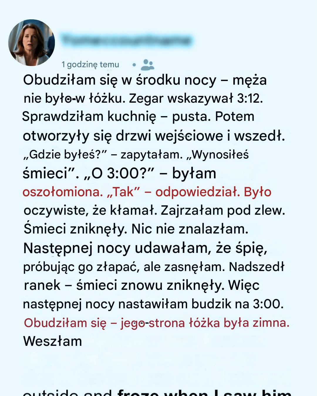 Po dwudziestu dwóch latach małżeństwa mój mąż nagle zaczął wynosić śmieci o trzeciej nad ranem. Nigdy – ani razu – nie zgłosił się na ochotnika do tego zadania. Dlaczego więc teraz? Pewnej nocy poszłam za nim… i to, co zobaczyłam, złamało mi serce w sposób, którego się nie spodziewałam.