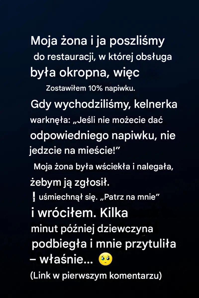 Niecałe dwie minuty później drzwi za nami otworzyły się z hukiem. Kelnerka wybiegła ze łzami w oczach, objęła mnie i przeprosiła za to, jak wcześniej się wyraziła.