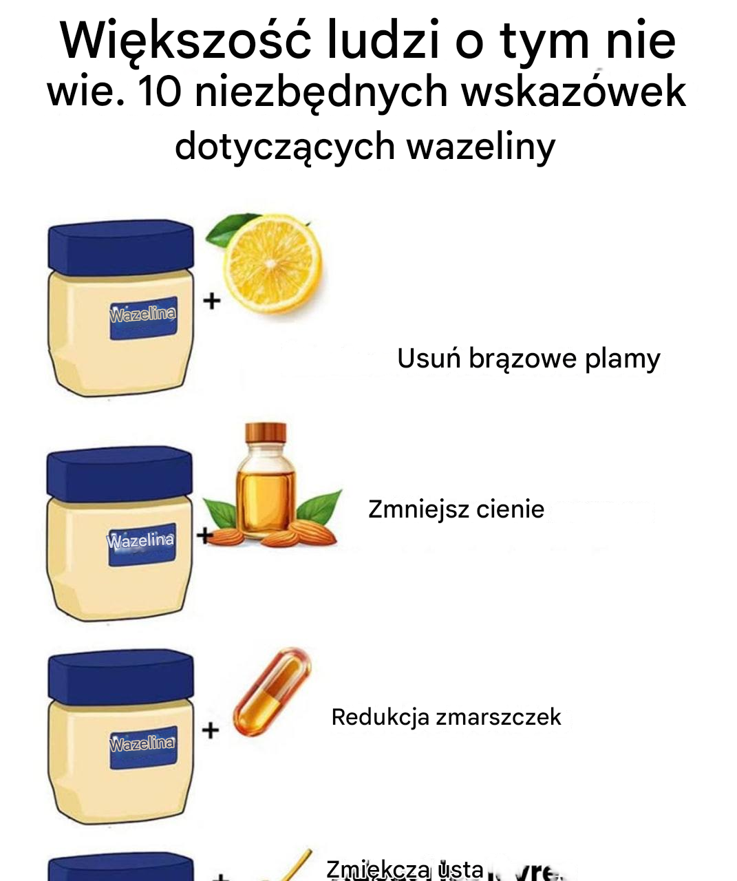 Rozpoznasz ją wszędzie – ten kultowy słoiczek, często zapomniany na dnie łazienkowej szuflady. Długo zarezerwowana dla suchych ust, wazelina ma w rzeczywistości o wiele więcej zastosowań, niż mogłoby się wydawać. Prosta, ekonomiczna i kojąca, przetrwała próbę czasu… a moja babcia już wiedziała, że można ją wykorzystać do o wiele więcej, niż nam zawsze mówiono. Oto 10 sprytnych wskazówek, z odpowiednimi ilościami, o których wiele osób wciąż nie wie.